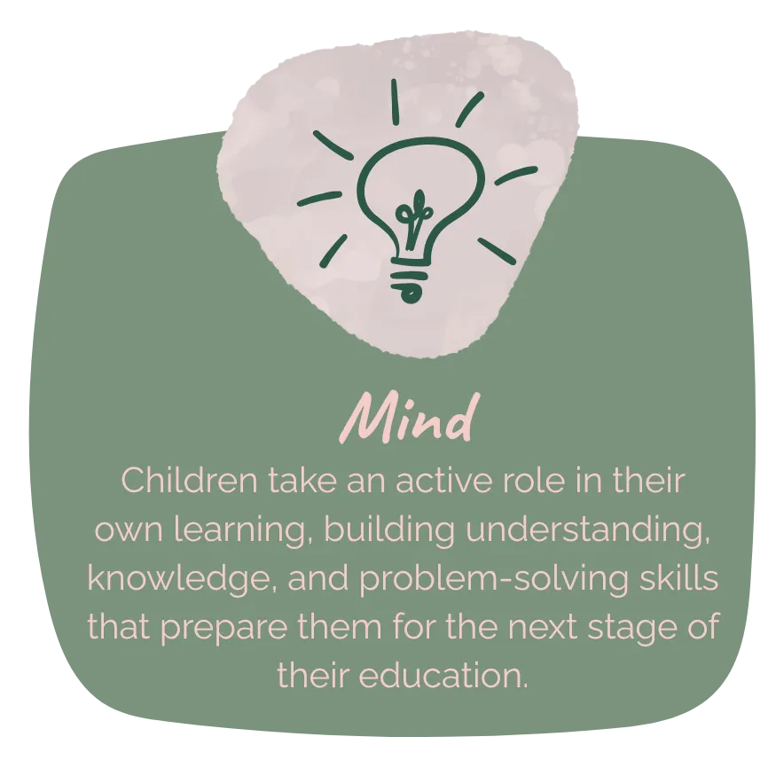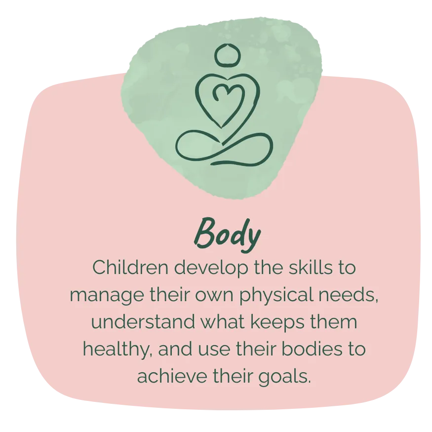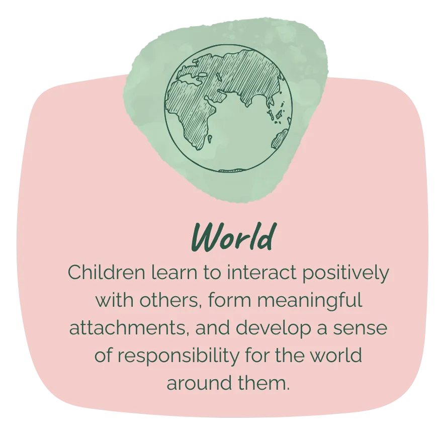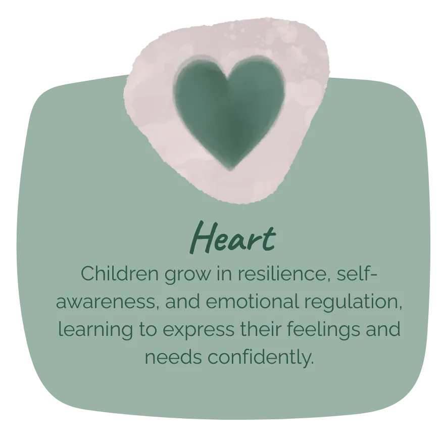 Our curriculum is structured around four key pillars—Body, Heart, Mind, and World—which shape every aspect of your child’s learning and development:
